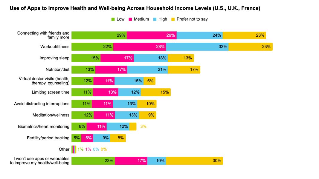 Household income levels also impacted how people plan to use apps for wellness in the U.S., U.K. and France. Nearly a quarter (23%) of respondents in low-income households indicate they don’t plan to use them; however, adoption rates across the 11 health/wellness app-enabled activities are remarkably similar across income levels. This suggests apps have democratized access to a broad range of beneficial services.