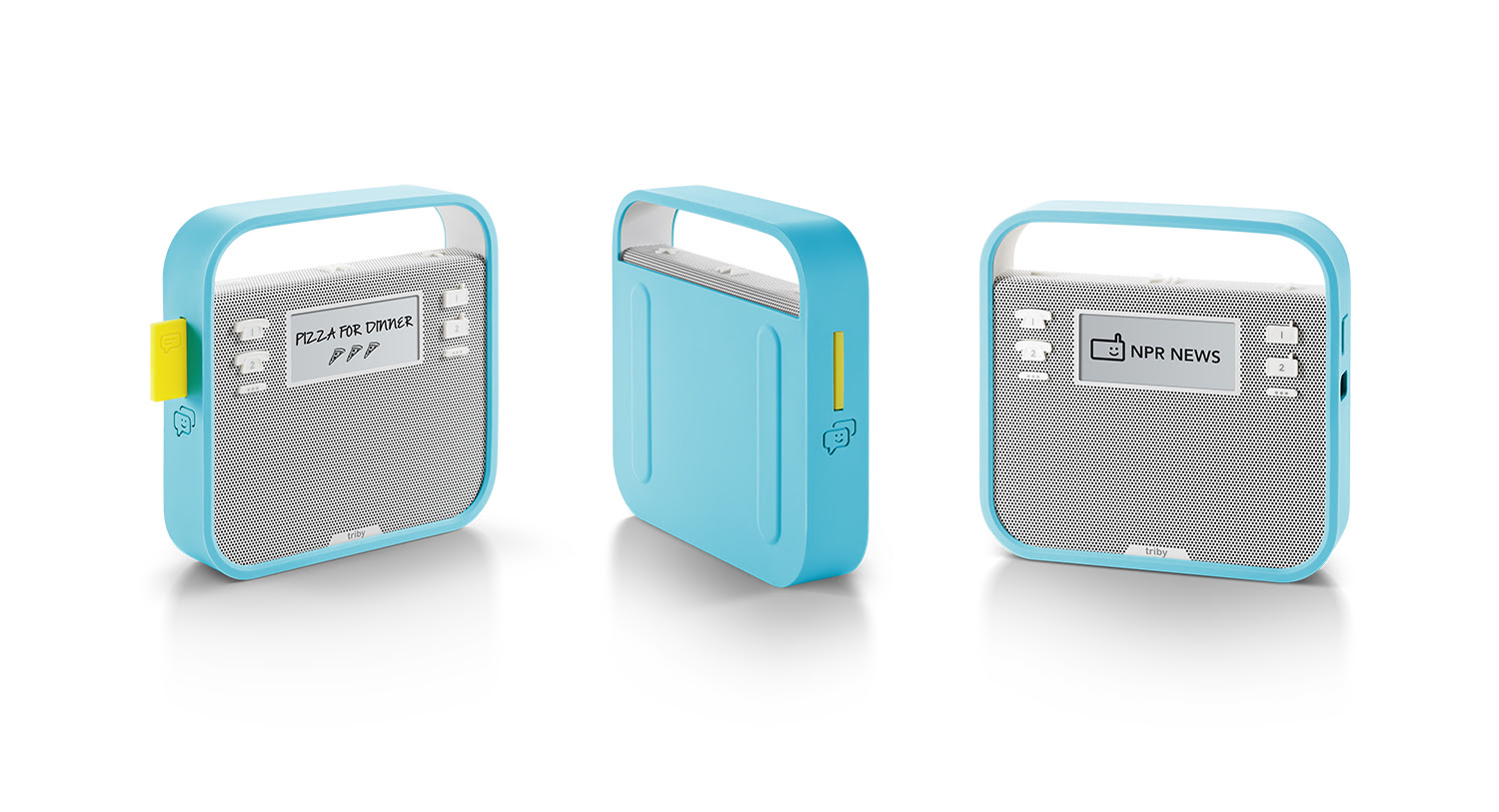 Through Bluetooth, any personal music device or smartphone can be paired. When connected through Wi-Fi, Triby blasts out music from online radio stations, as well as premium services such as Spotify Connect. Users can pre-set their favorite playlists and radio stations through the app, and access and manage them at the push of a button. Triby’s E-ink screen is always on and displays information about the station, playlist or track they are listening to.