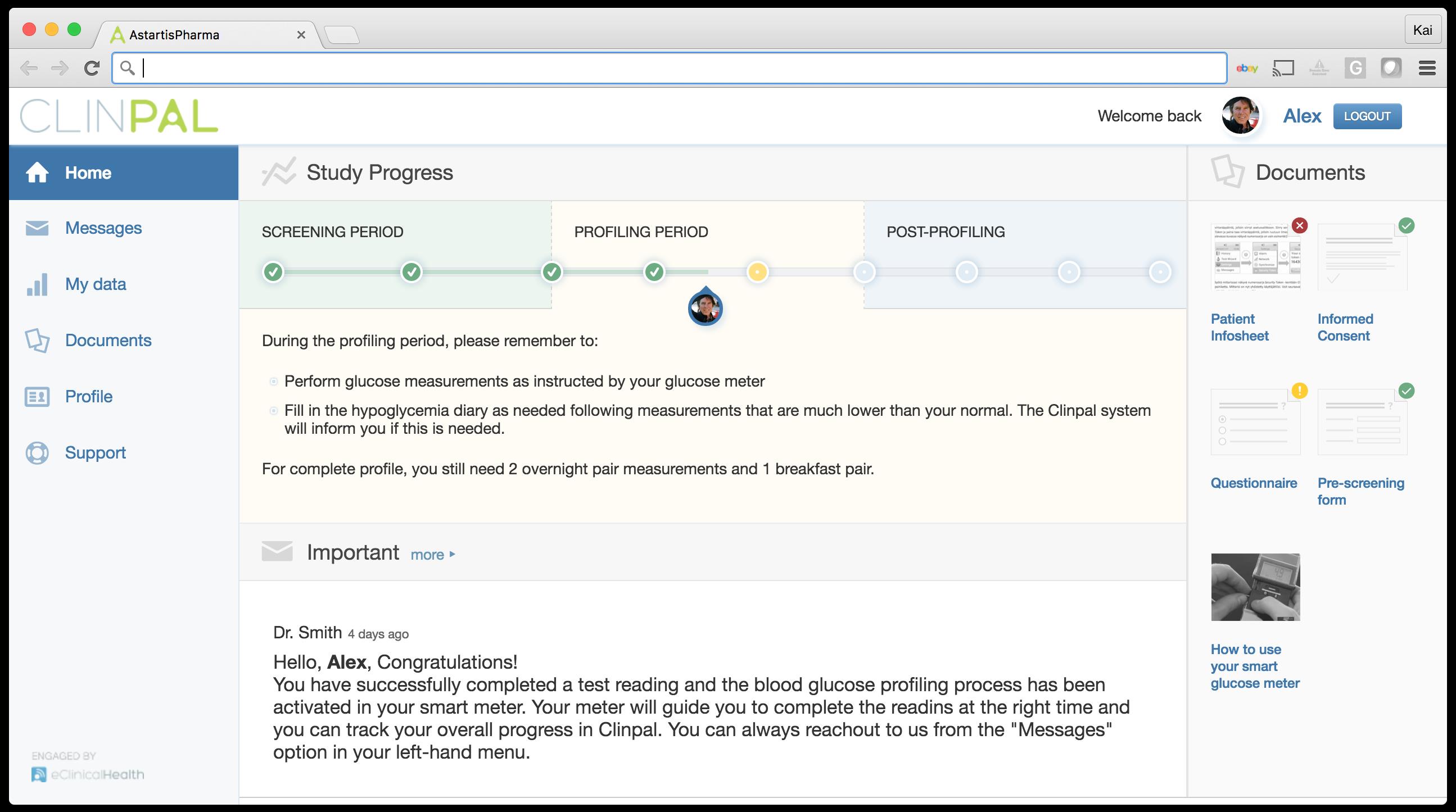 Sixty patients — all recruited through Facebook — participated in the study that had no site visits. Patients self-registered their interest in the Clinpal system, after which the coordinating study site reviewed their application. Patients who were selected reviewed electronic patient information before signing the informed consent form electronically. Study materials were delivered directly to patients who then connected the smart, wireless glucose meter with their personal Clinpal account. Actively guided by the Mendor Smart glucose meter, patients completed an innovative glucose profiling protocol. Their glucose measurements were automatically transmitted from the device into the Clinpal system where they were available for real-time review by the patients and the study site.