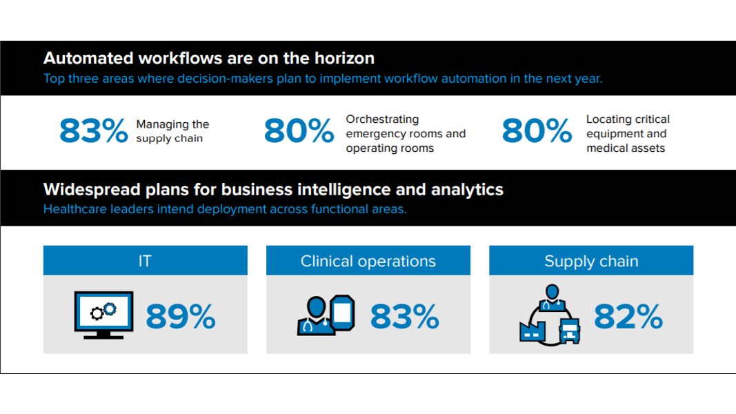 - Approximately 80% of executives plan to automate workflows in the next year to improve supply chain management, make it easier to locate critical equipment and medical assets, better orchestrate emergency rooms and operating rooms, and streamline staff scheduling.