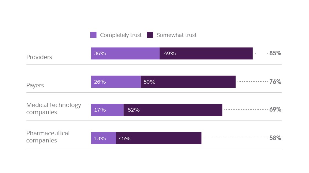 While the pandemic impacted healthcare and life sciences companies across the board, consumer trust in 2021 varies by sector. As the daily applause for healthcare workers may have indicated, care providers lead the pack in consumer trust, with 85% of consumers saying they somewhat or completely trust their providers.