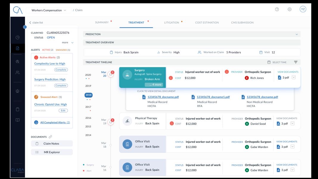 As the leading provider of artificial intelligence (AI) technology for commercial insurance claims optimization, CLARA offers a suite of complementary products that work alongside Optics. CLARA Treatment helps carriers determine which healthcare providers are most likely to produce positive patient outcomes; CLARA Triage spots potentially costly claims before they escalate; and CLARA Litigation assesses risk and helps carriers manage attorney performance.